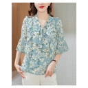 Atasan floral dengan potongan feminin dan siluet ringan yang memberi kesan lembut serta anggun. Detail pita di bagian leher menambah sentuhan manis, cocok untuk tampilan daily, kerja santai, maupun acara kasual. Mudah dipadukan dengan rok atau celana bahan.