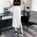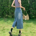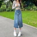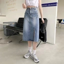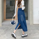Rok jeans panjang dengan potongan high waist yang memberikan siluet ramping dan stylish. Dilengkapi detail slit depan yang memberi kesan modern sekaligus memudahkan bergerak. Tetap nyaman dipakai seharian, cocok untuk casual look, hangout, maupun daily outfit ala Korean style.