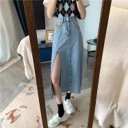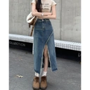 Rok jeans panjang dengan potongan high waist yang memberikan siluet ramping dan stylish. Dilengkapi detail slit depan yang memberi kesan modern sekaligus memudahkan bergerak. Tetap nyaman dipakai seharian, cocok untuk casual look, hangout, maupun daily outfit ala Korean style.