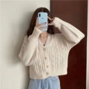 Cardigan rajut wanita dengan model V-neck dan detail kancing mutiara yang elegan. Tekstur rajut berpola memberikan tampilan classy dan lembut, mudah dipadukan dengan inner basic maupun dress untuk gaya chic ala Korean style. Cocok untuk hangout, kerja santai, hingga acara semi-formal.