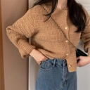 Cardigan rajut wanita dengan tekstur elegan dan detail kancing mutiara yang manis. Potongannya simpel namun classy, mudah dipadukan dengan inner basic dan jeans untuk tampilan chic ala Korean look. Cocok dipakai hangout, kerja santai, atau acara semi-formal.